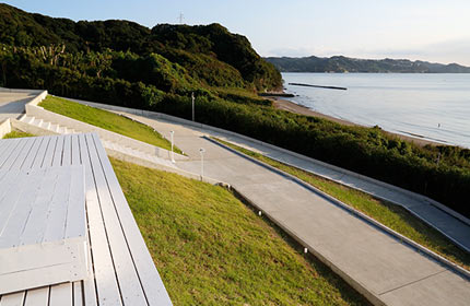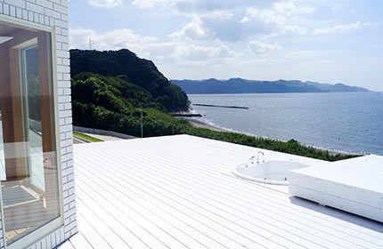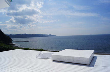 海側にはウッドデッキと芝の斜面があり、